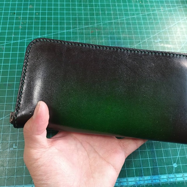 外革はヌメ革を緑と黒のグラデーションに染色、内革は生成で無染色のヌメ革を使用しています。 好きな色で作ることが可能です。 コインポケットは中央に独立して配置、お札スペースは2箇所、カードは8枚、その他ポケット2箇所と大容量の収納が可能です。 全てが手作業のため、注文から完成まで一週間ほどかかります。 #レザークラフト #革細工 #長財布 #革財布