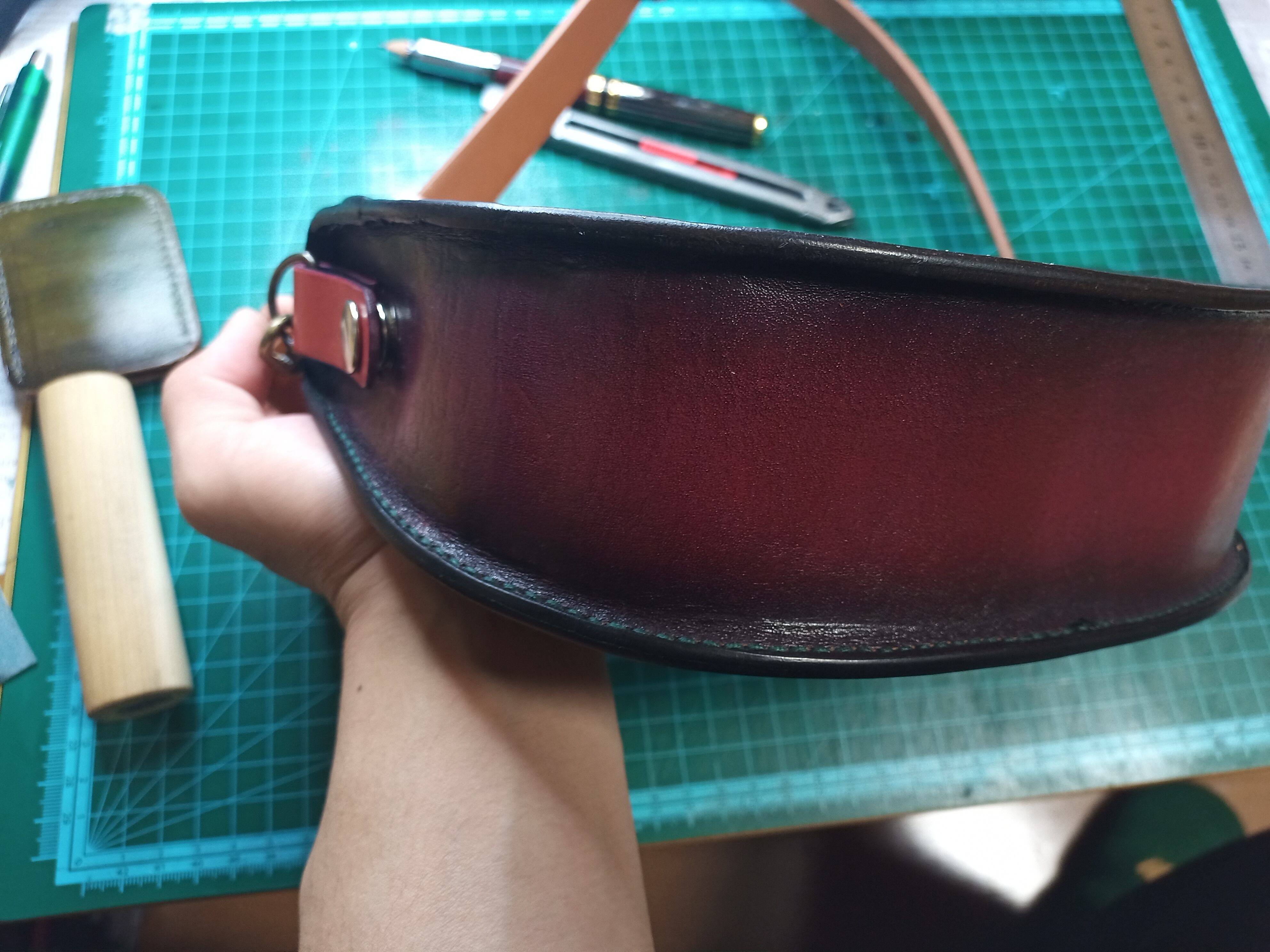 ヌメ革を青、赤、緑の3色にグラデーションで染めあげ、ショルダーバッグに製鞄しました。小さめですが、スマホとサイフと、キーケースくらいなら普通に入れることができます。