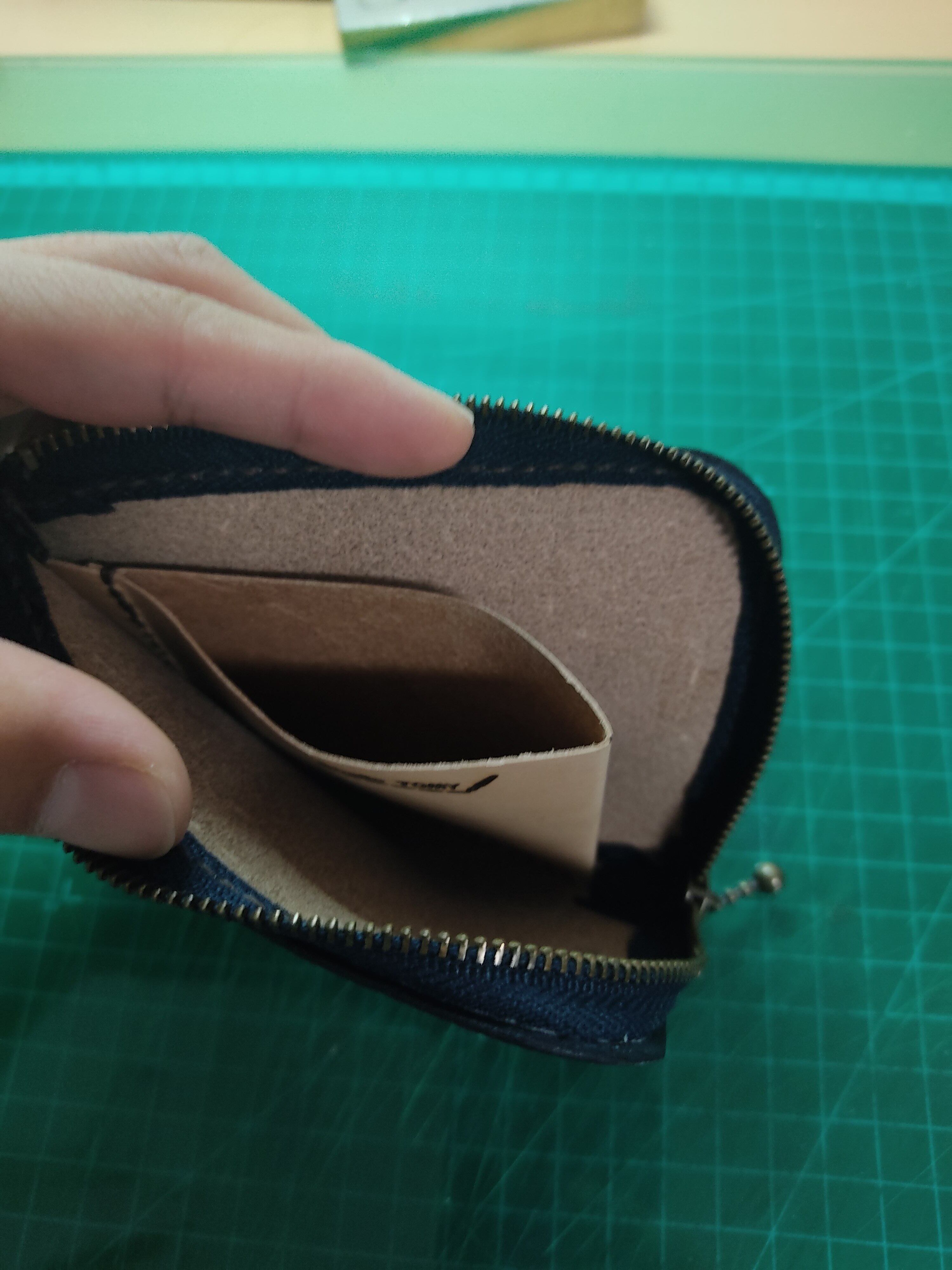 L字タイプのシンプルな薄い財布です。マチはなく、小銭入れで分割された2スペースがあります。ファスナーを閉めればコインは他のスペースに出ていかない設計です。シンプルな構造ながらコイン、カード、お札を混ざることなく収納できます。