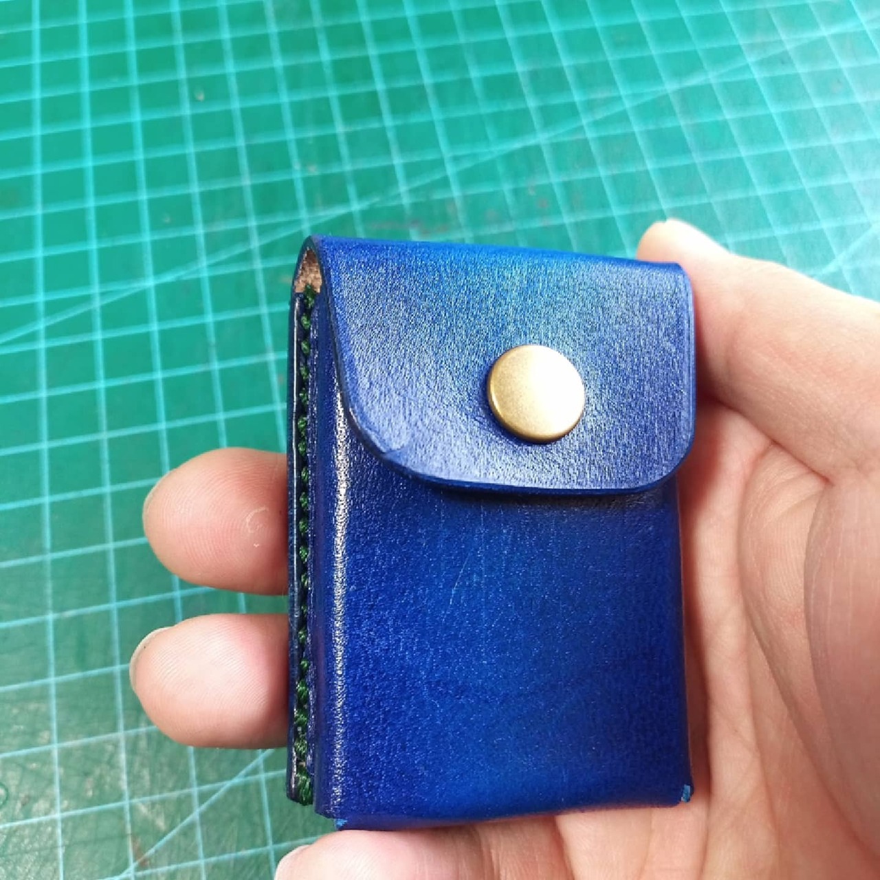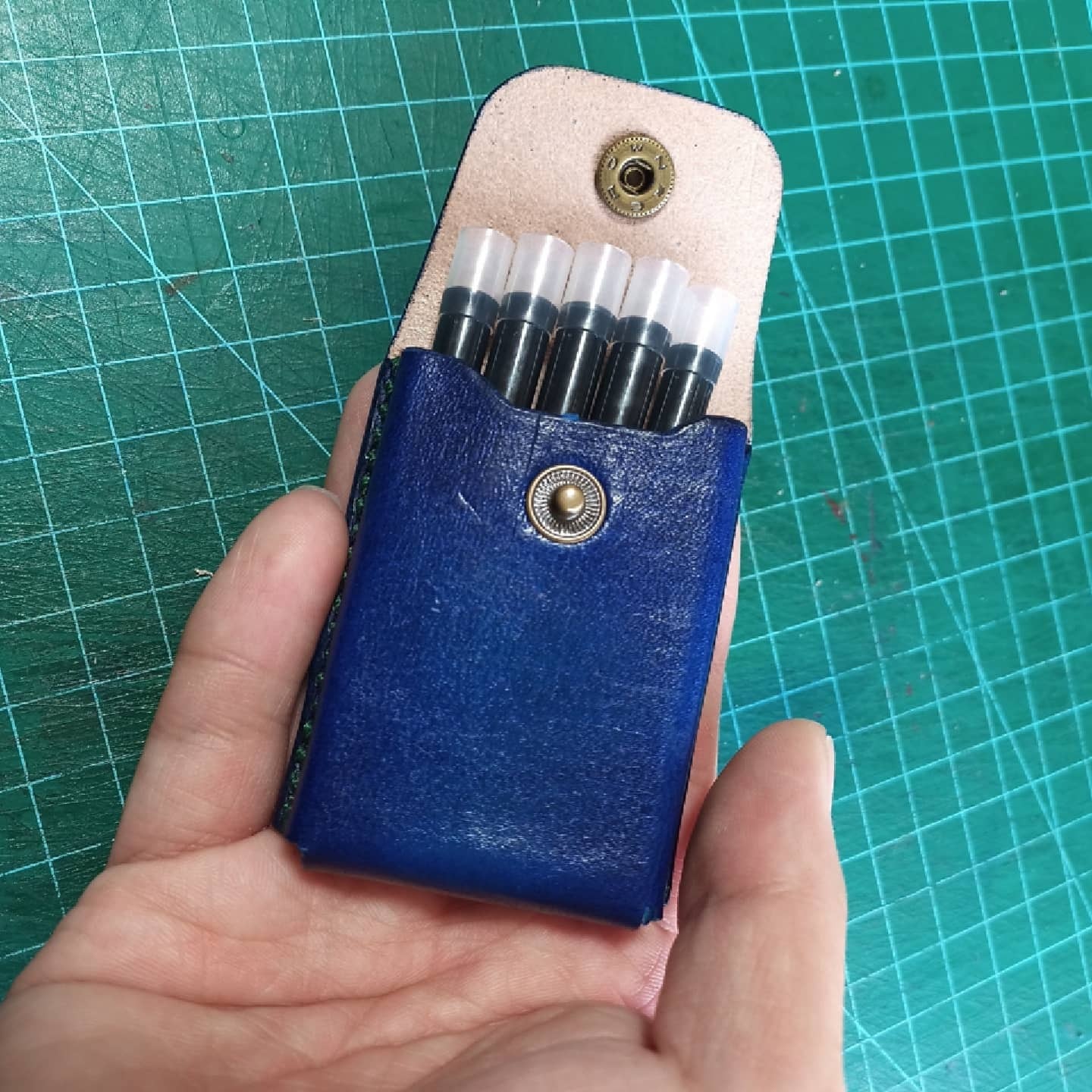 万年筆のインク(パイロット色彩雫の天色、深海)を使って染色し、万年筆カートリッジケースを作ってみたものです。