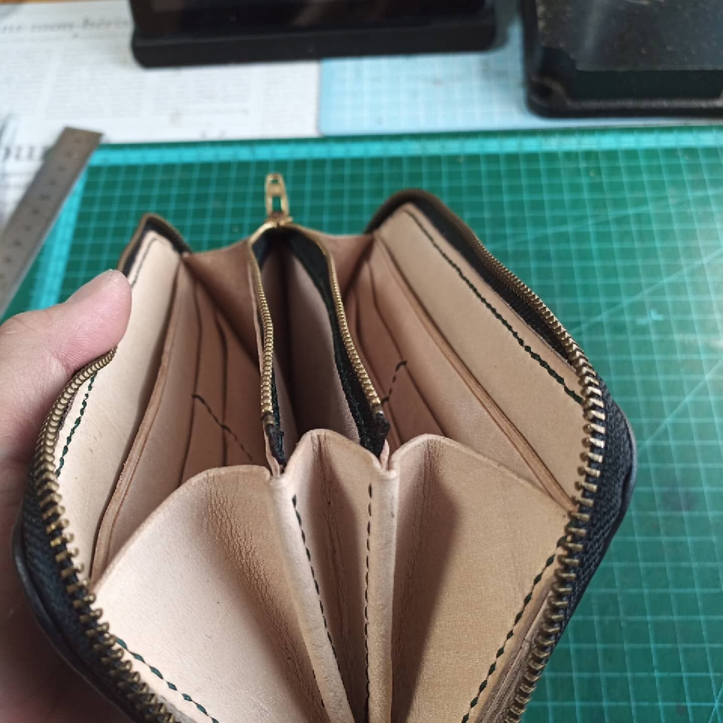 外革はヌメ革を緑と黒のグラデーションに染色、内革は生成で無染色のヌメ革を使用しています。