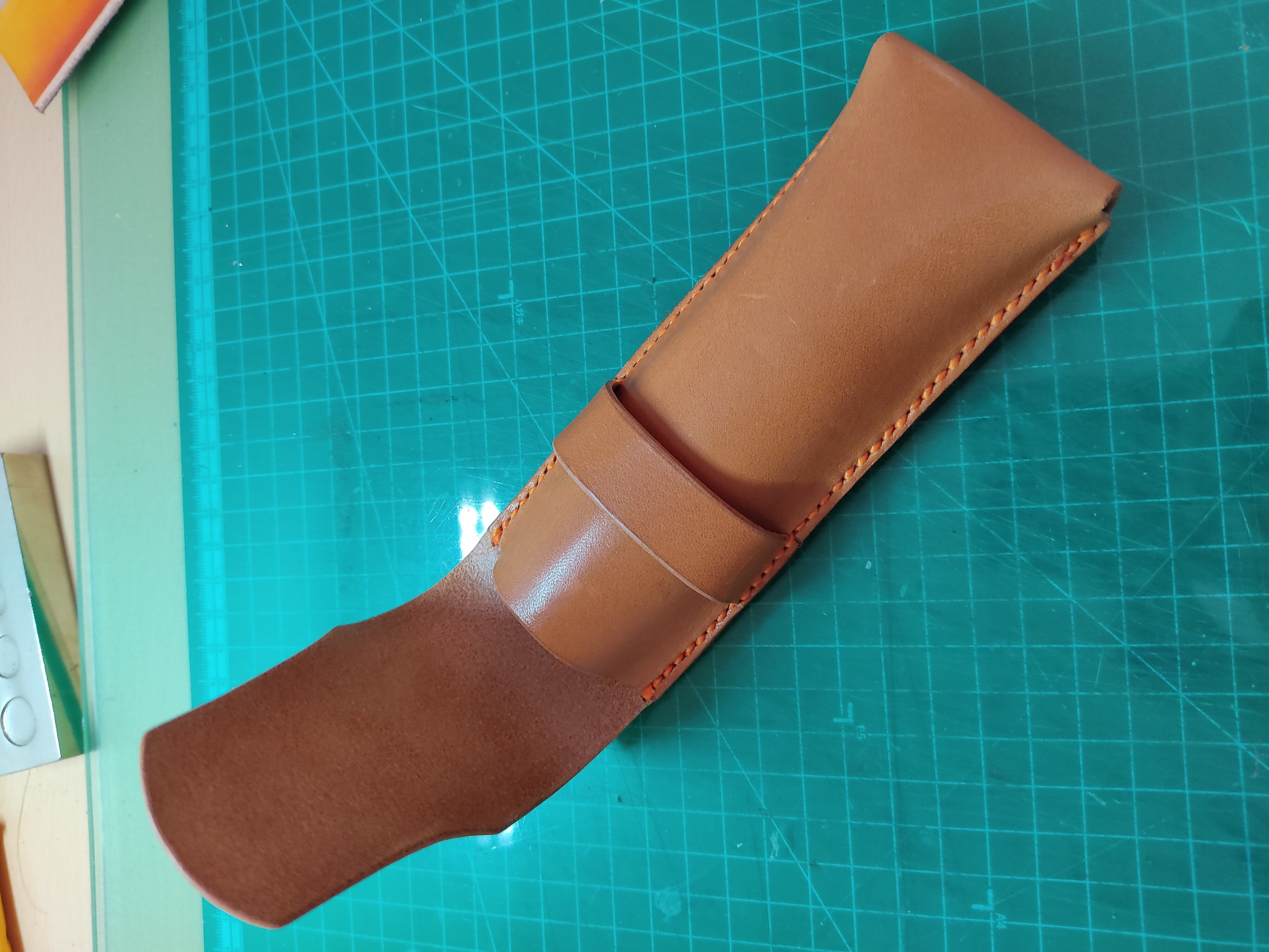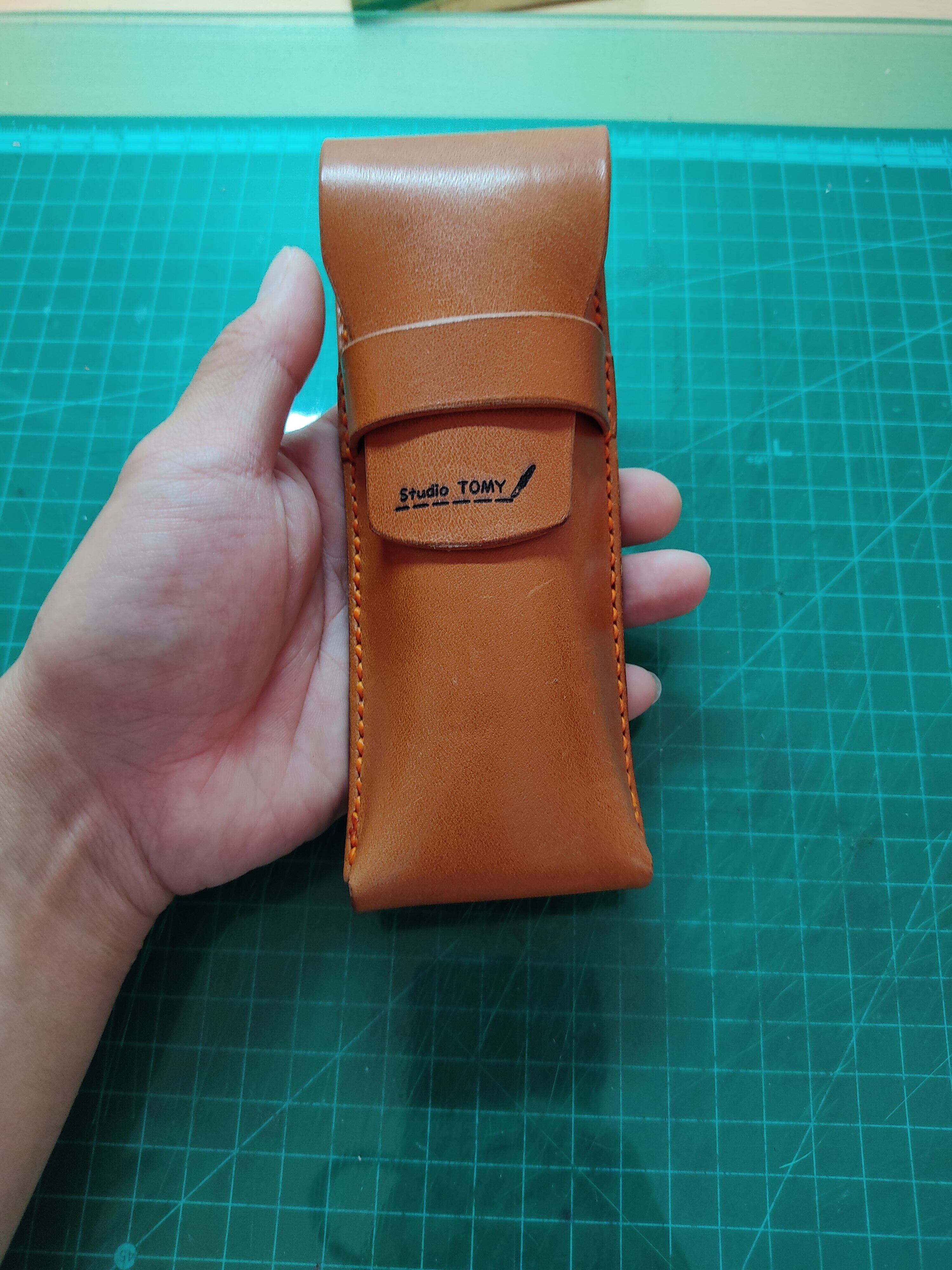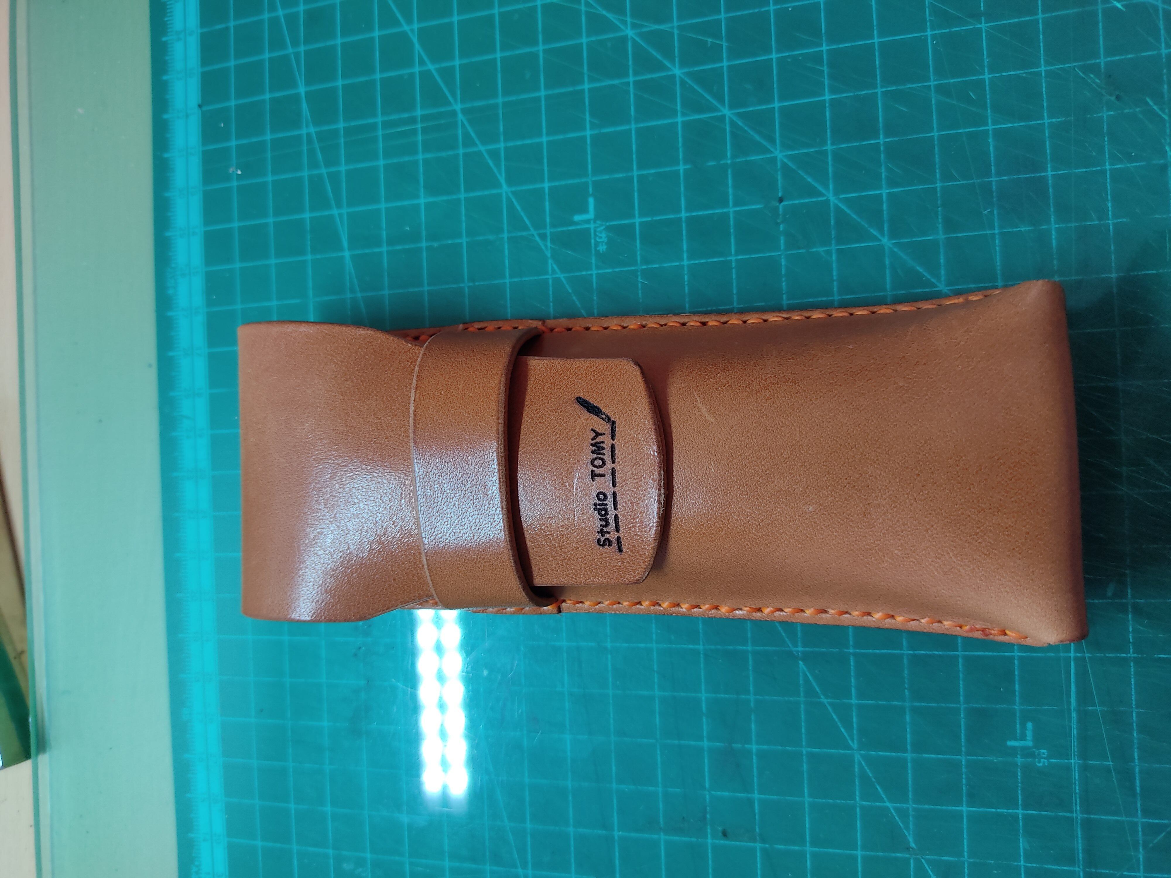 キャメルカラーに染色されたヌメ革を使ったシンプルなペンケースです。太めの万年筆なら2本、ボールペンなら3本程度入ります。素材上、傷が付きやすいですが劣化していくというよりも味が出てくるタイプの革です。