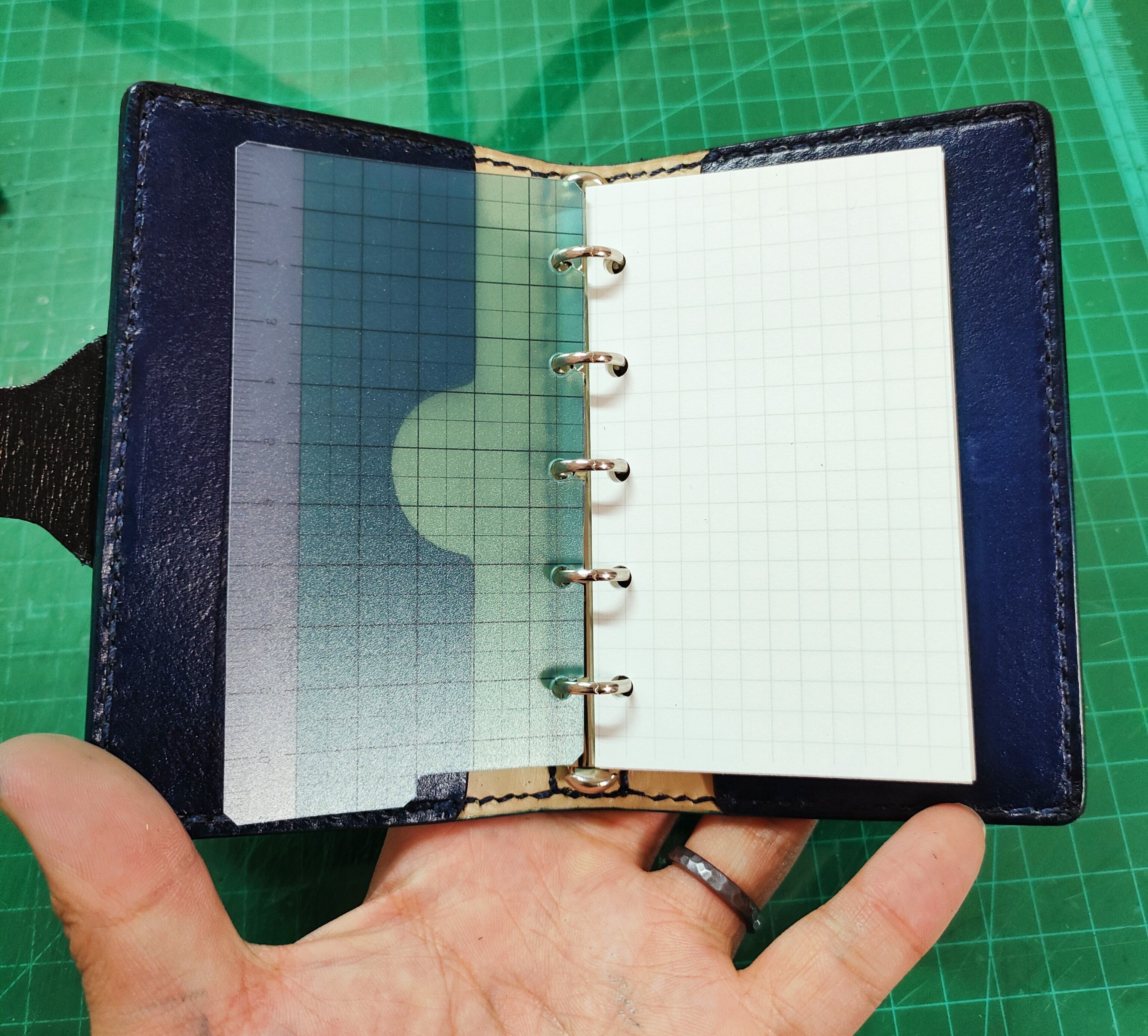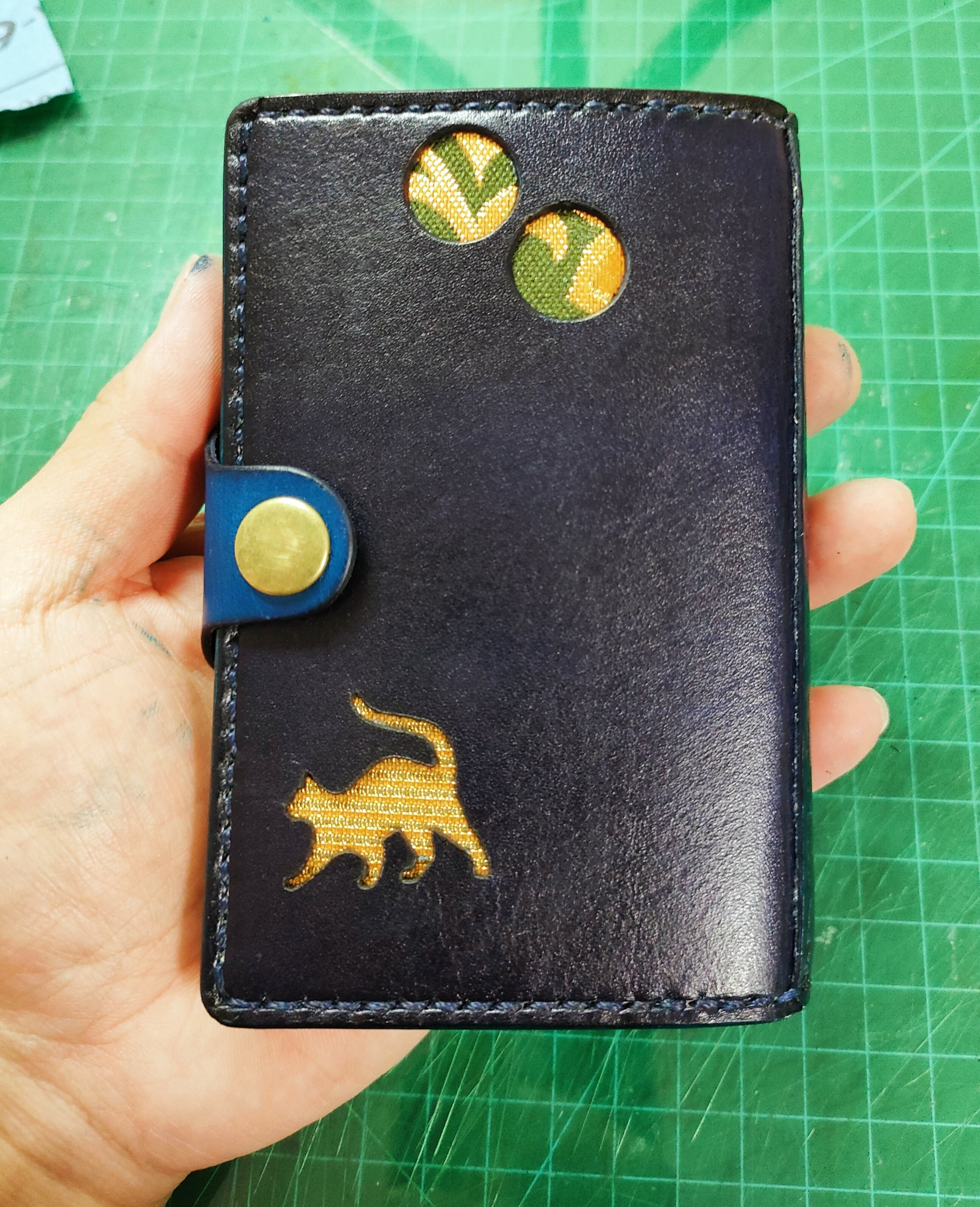 応用で色んなものが作れます。今回はマイクロ5という手のひらサイズのバインダー金具を使いましたが、別に何でもよくて、バイブルサイズでもA5サイズでも作れます。革の色も、切り絵のデザインも、中の布の柄も自由自在です。
