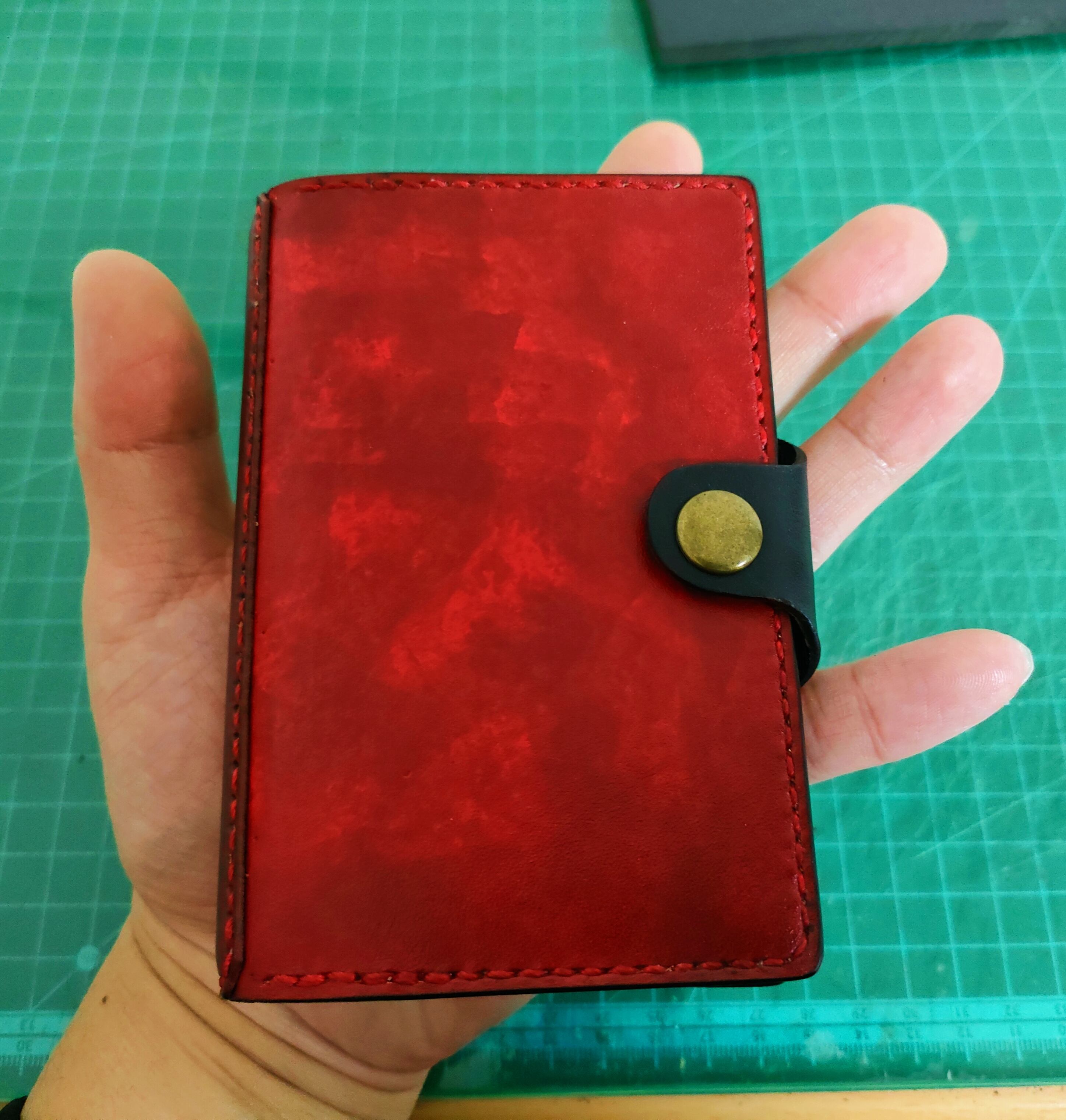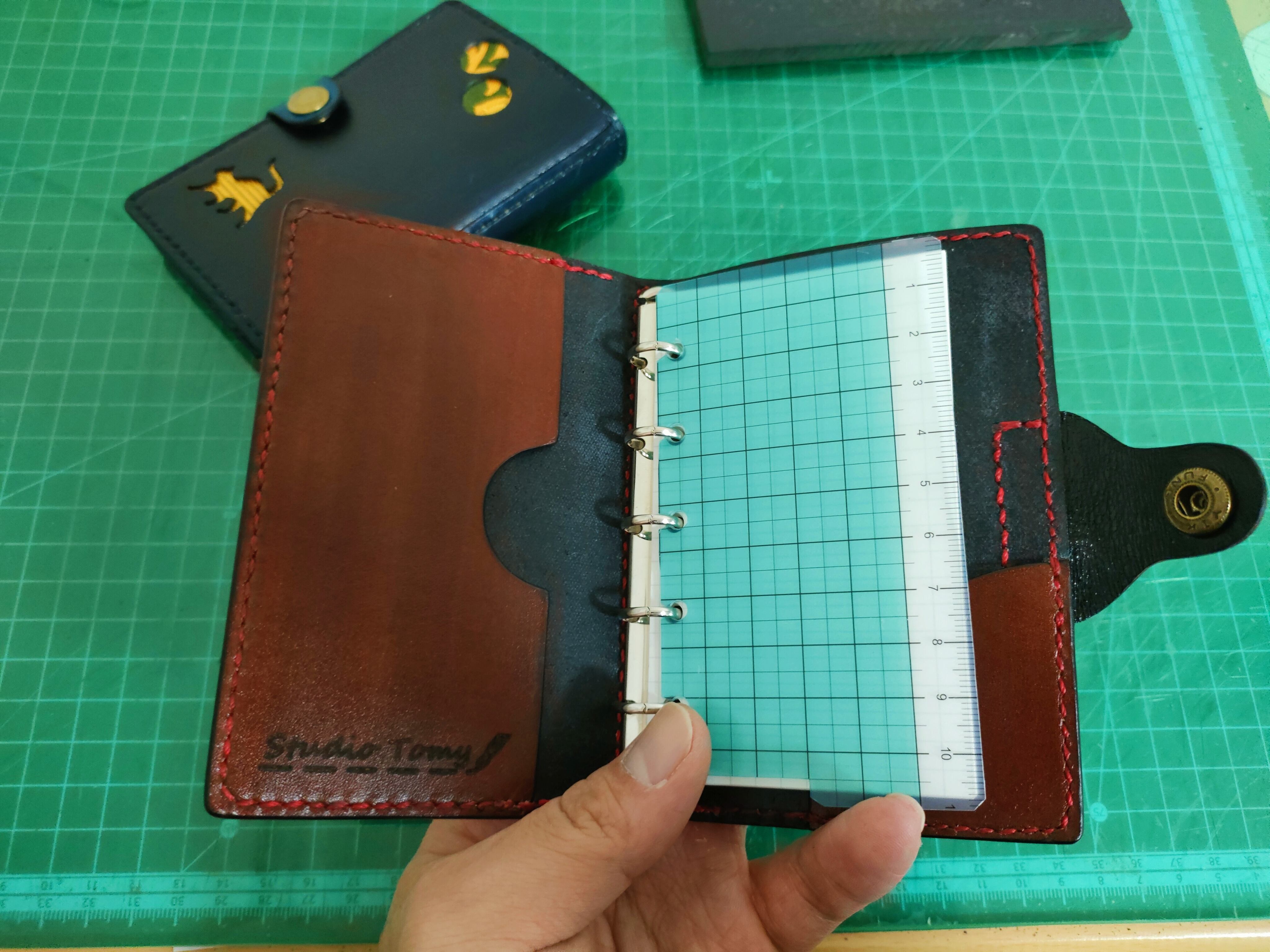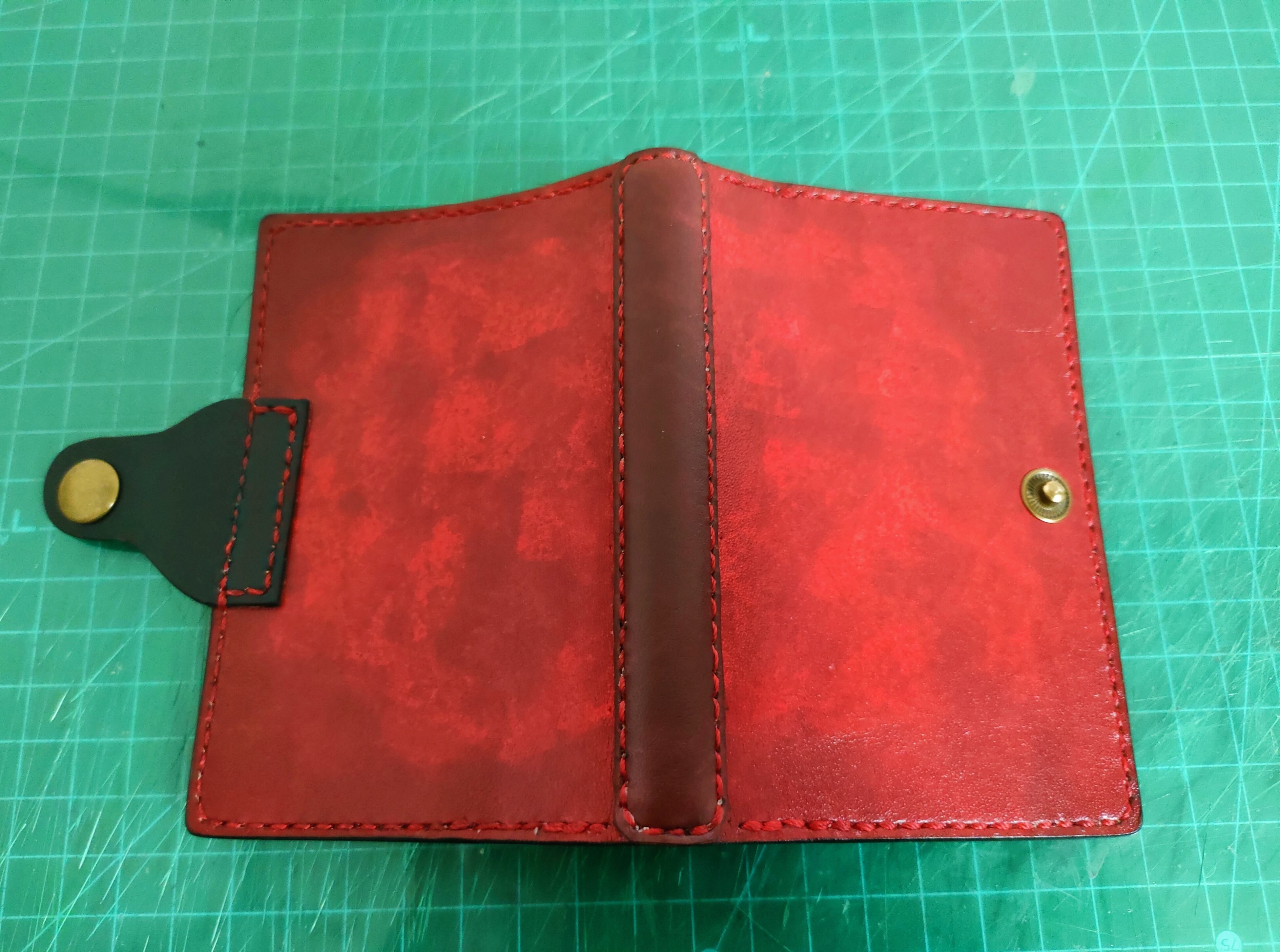本体は1.5mmのヌメ革、背表紙(金具隠し)0.8mmのヌメ革、内ポケットは1mmのヌメ革をそれぞれ染色しています。