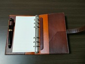 ヌメ革を手染色で茶色のグラデーションに染めたバイブルサイズのシステム手帳です。