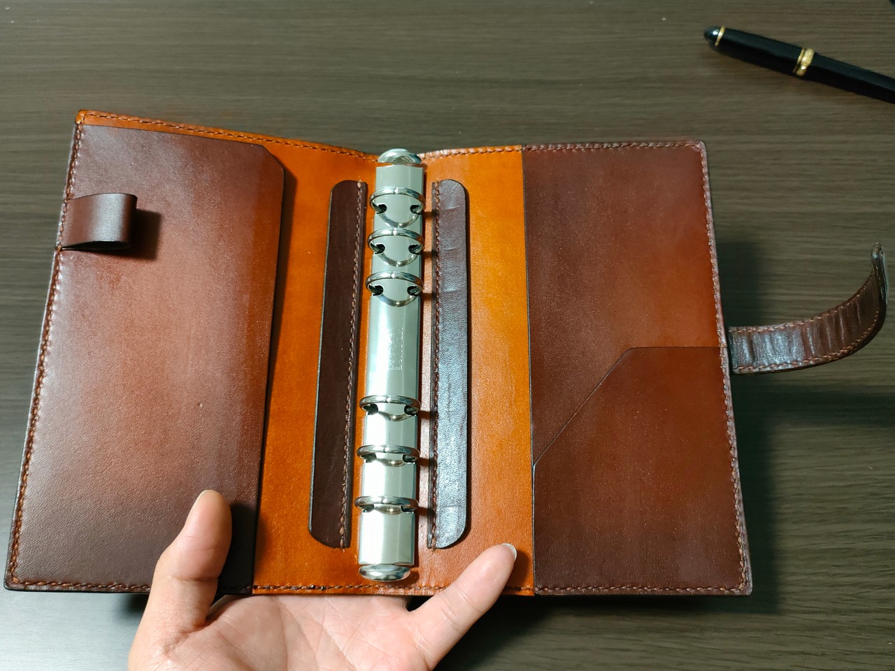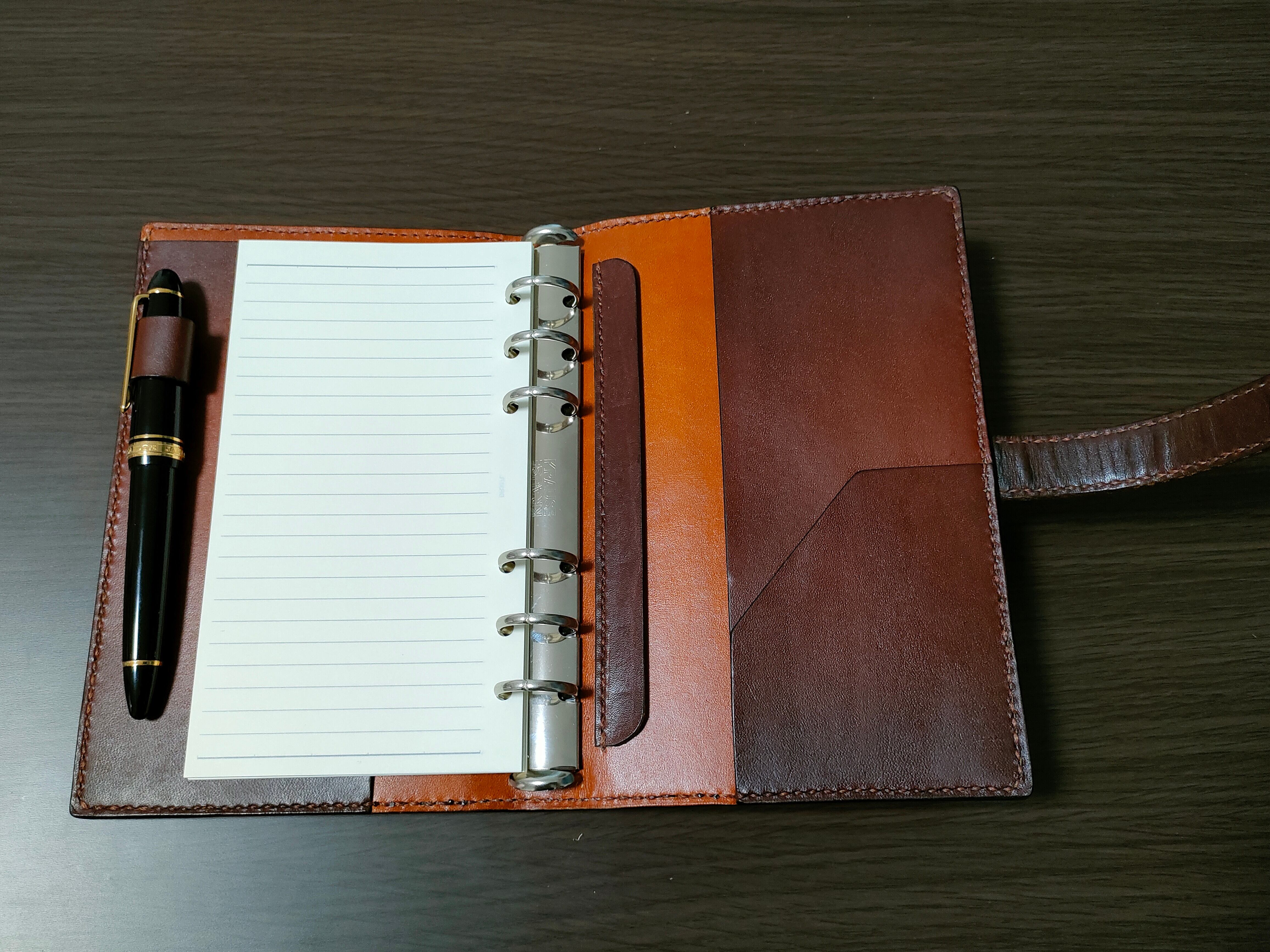 表革は1.5mm厚、内革は1mm厚のものを組み合わせています。表革と内革の間にはプラスチックの薄い芯材を入れているので、硬すぎず柔らかすぎず、システム手帳らしい丁度よい硬さに仕上げました。内革には左右にポケットを付けています。左には大きく開く挟むタイプのポケット、右にはしっかり挟めるポケットを付けました。