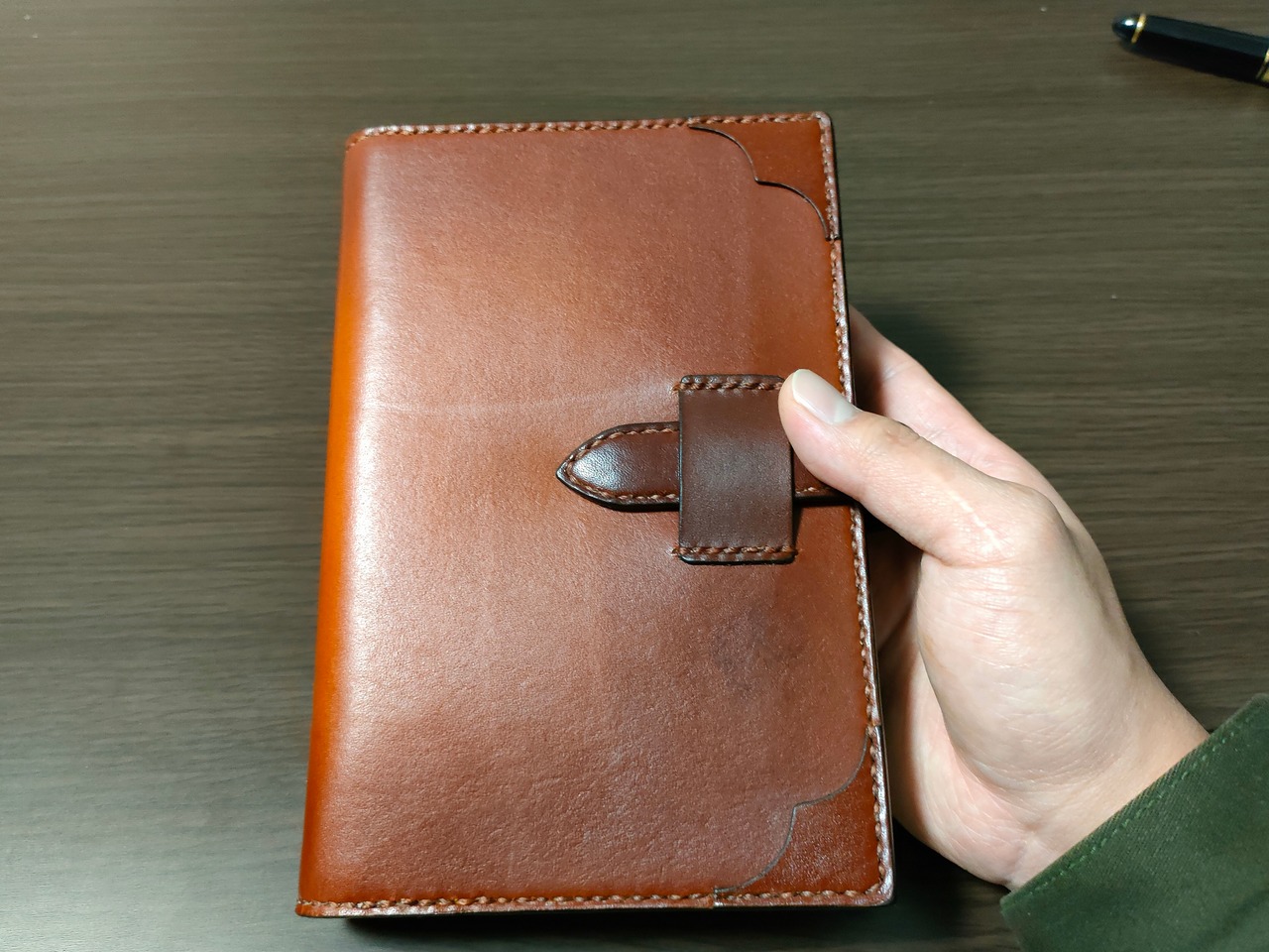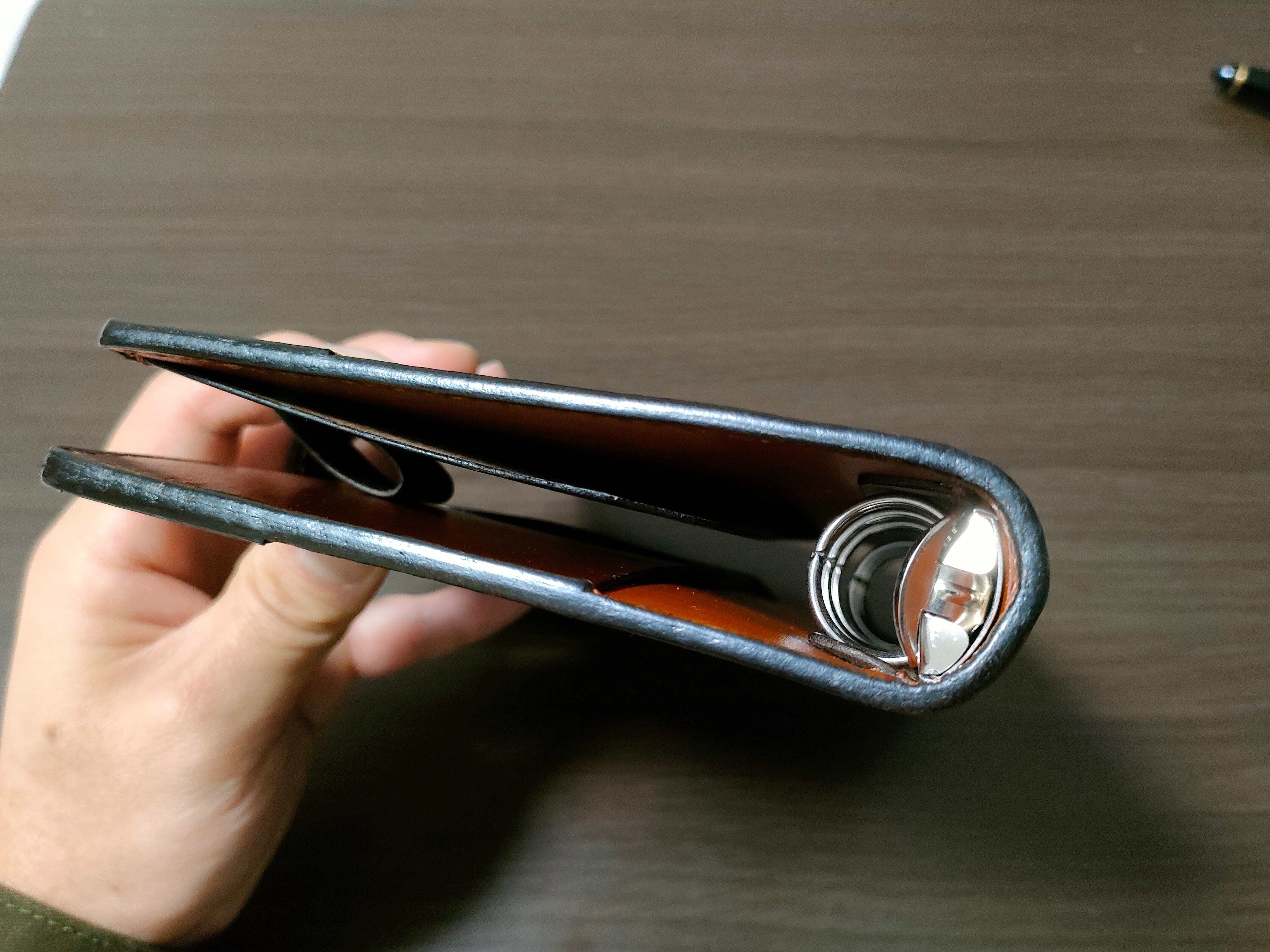 バインダー金具には信頼と実績のクラウゼ社の高級バインダーを使っており、頑丈です。ベルトは金具を使わないベルトタイプにしています、ベルトは革の間に革を挟んで縫い上げた3層構造で強度と見た目の立体感を追求しました。