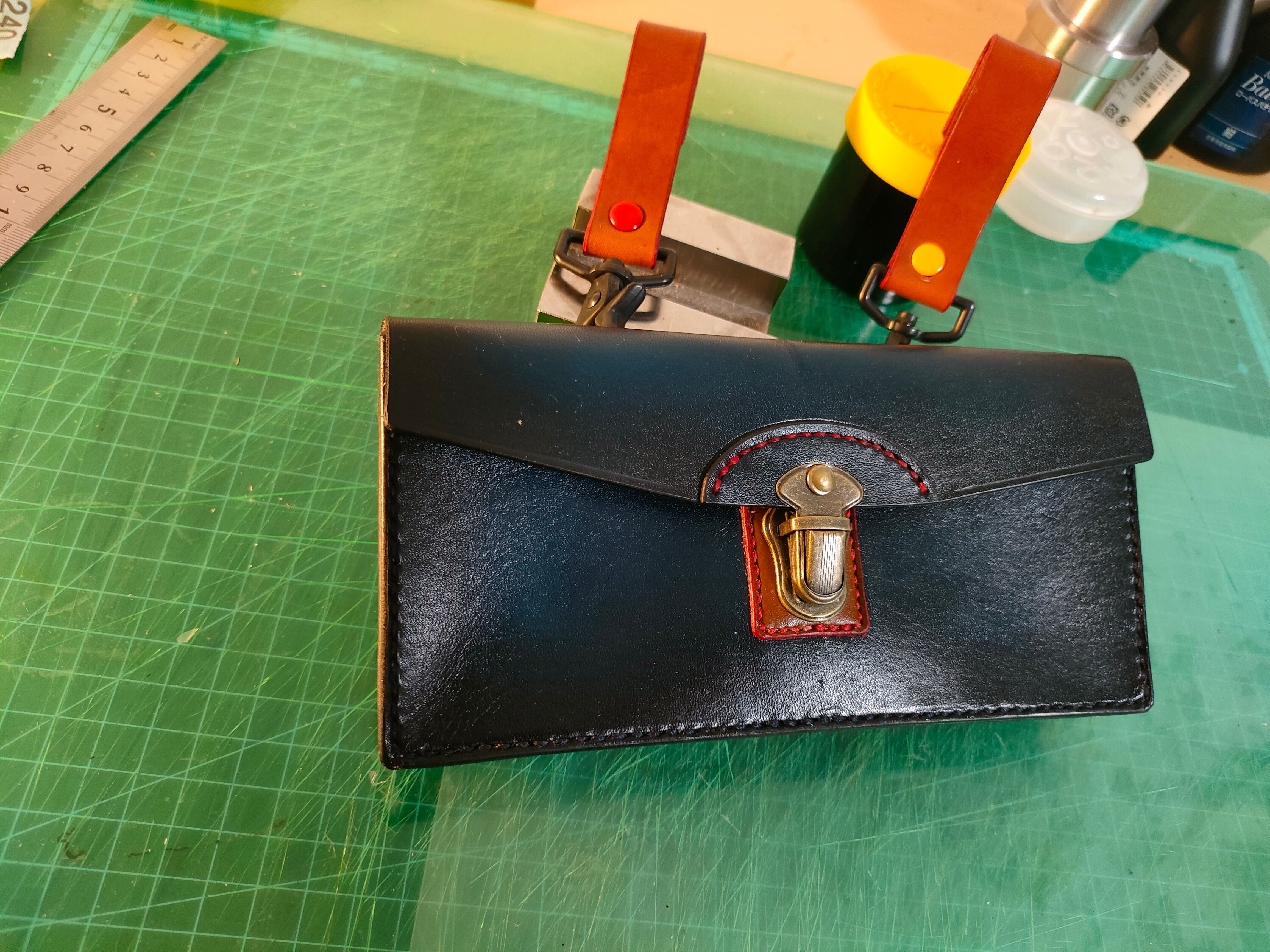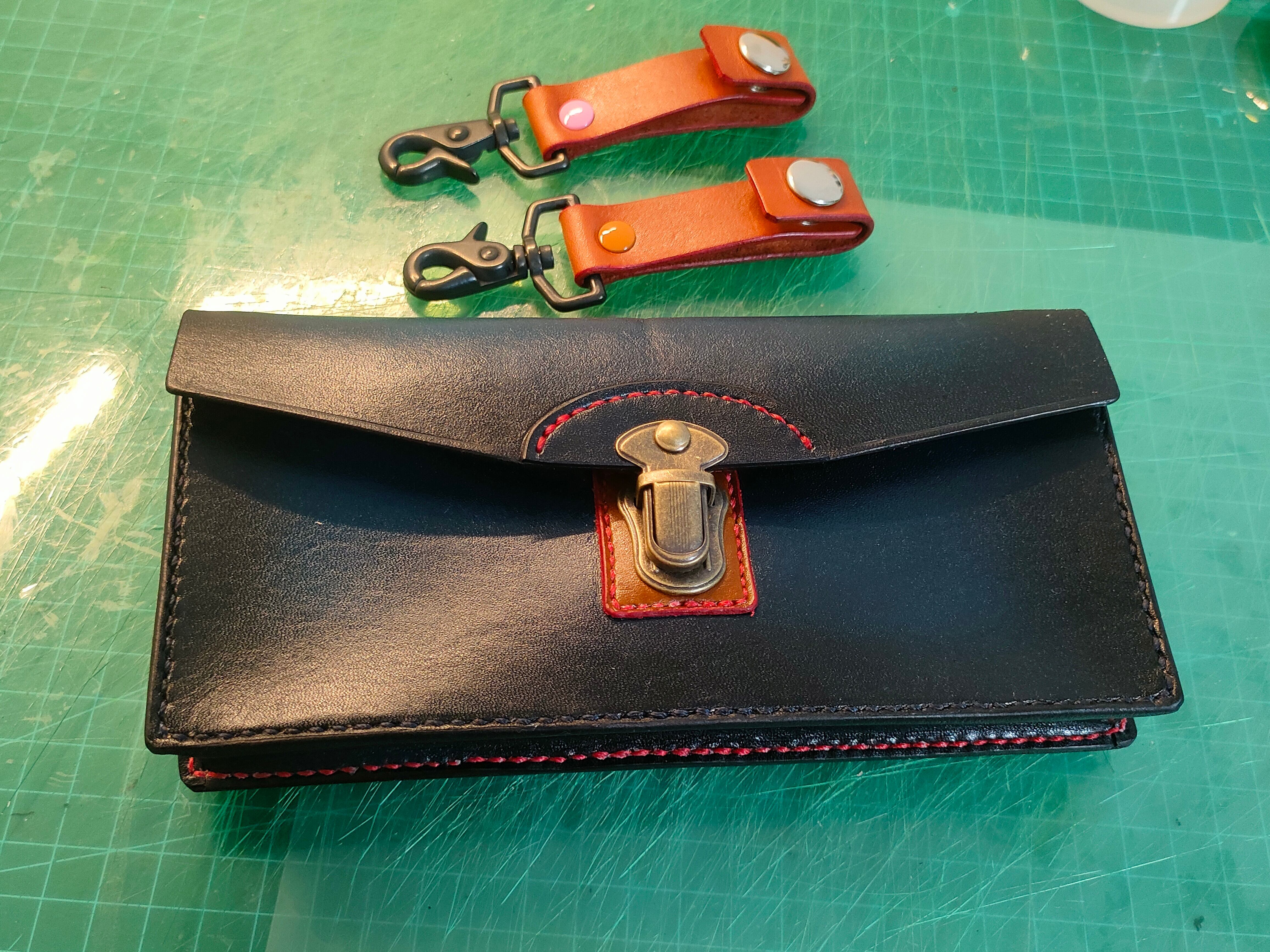 色はヌメ革を紺色のグラデーションに染めてます。理由は作業服が紺色だから親和性を高めるためで、差色として茶色の錠受けと赤のステッチを入れました。