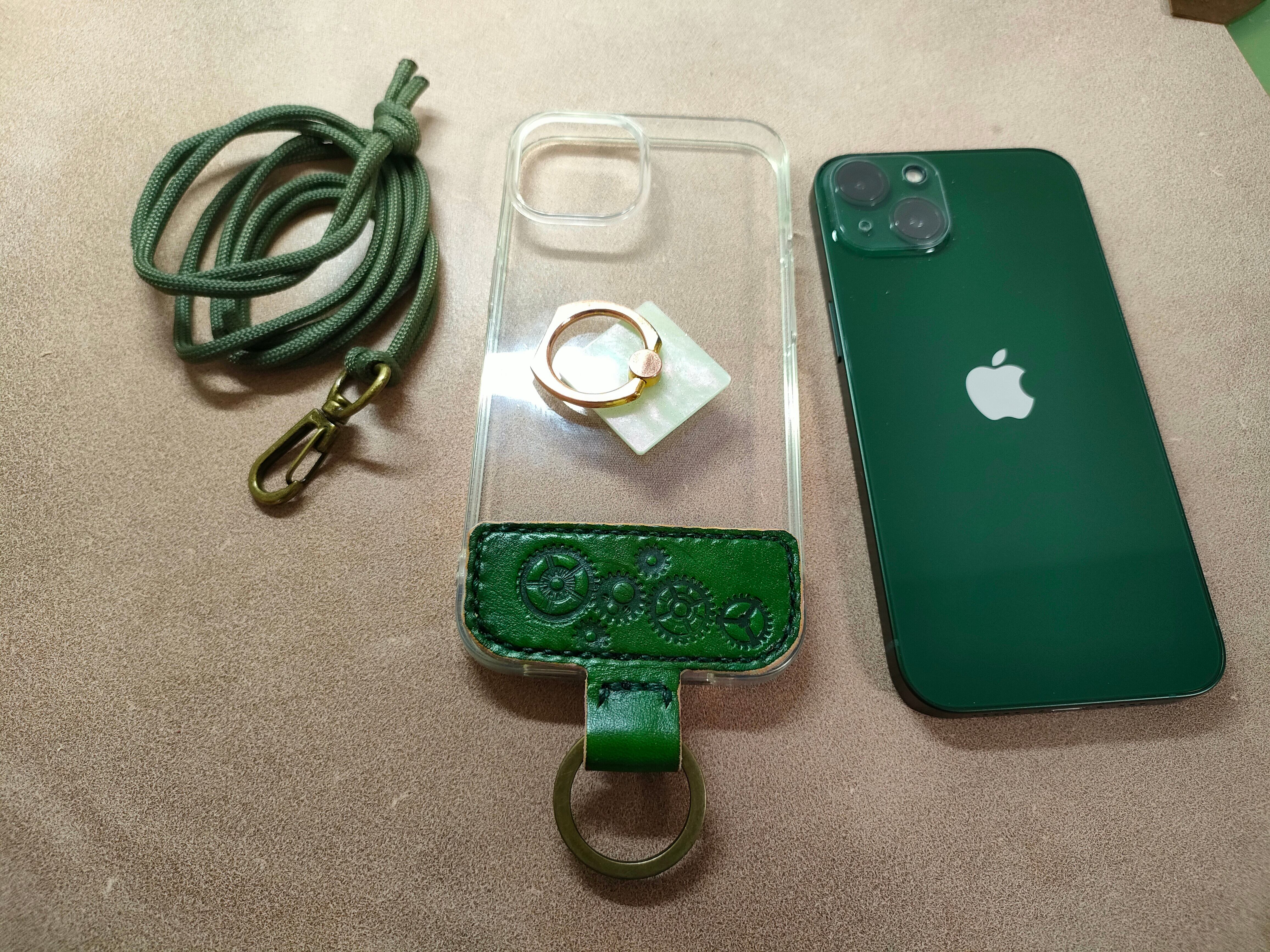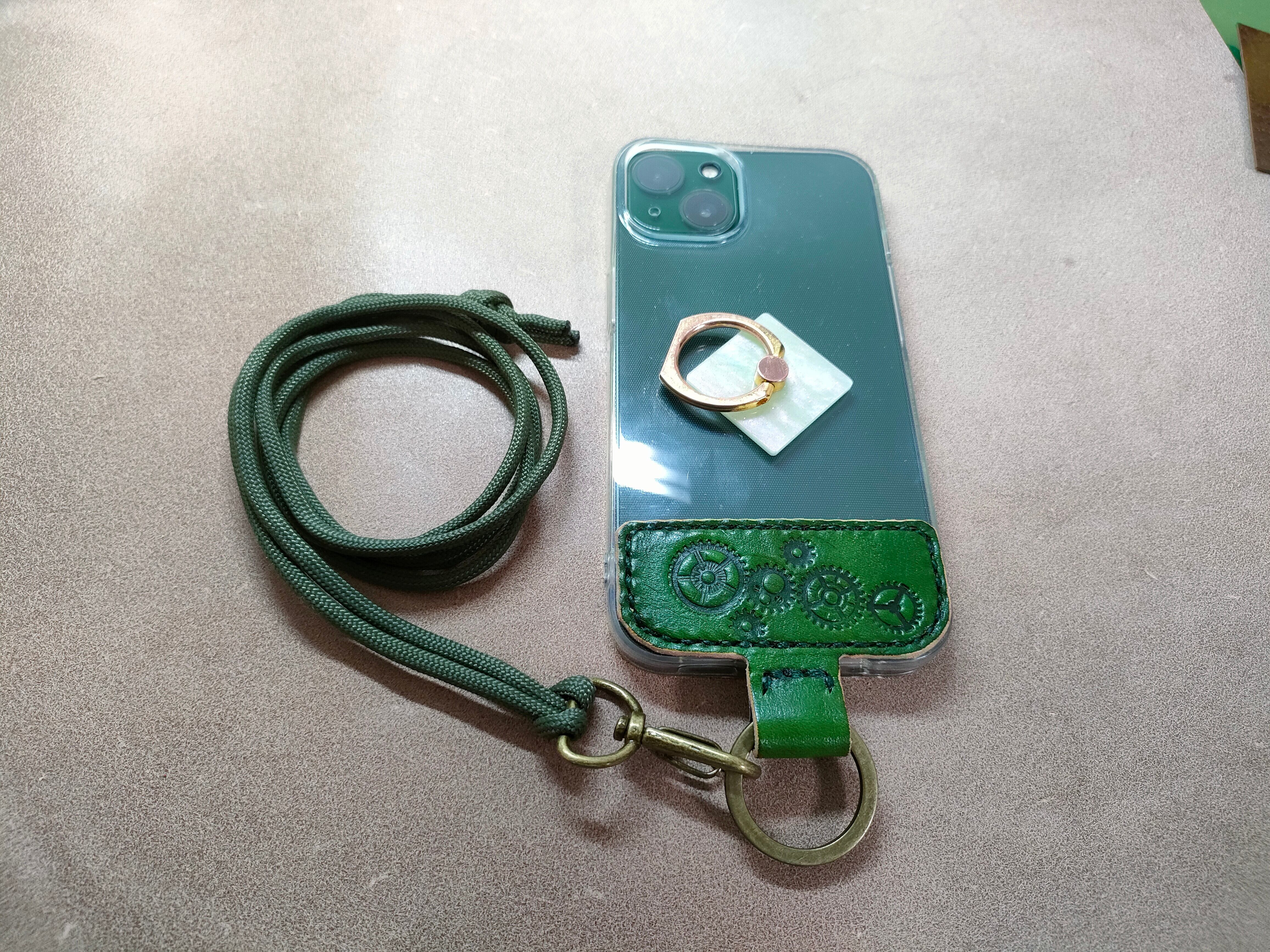 最近はやっているスマホショルダーを作ってみました。スマホの色に合わせて余っていた緑のヌメ革ハギレを使ってます。基本的には在庫はありません、注文を受けてから作り始めます。ですので、どのような色にするか、刻印をどのようにするのかはお客さんと相談して決めていきます。
