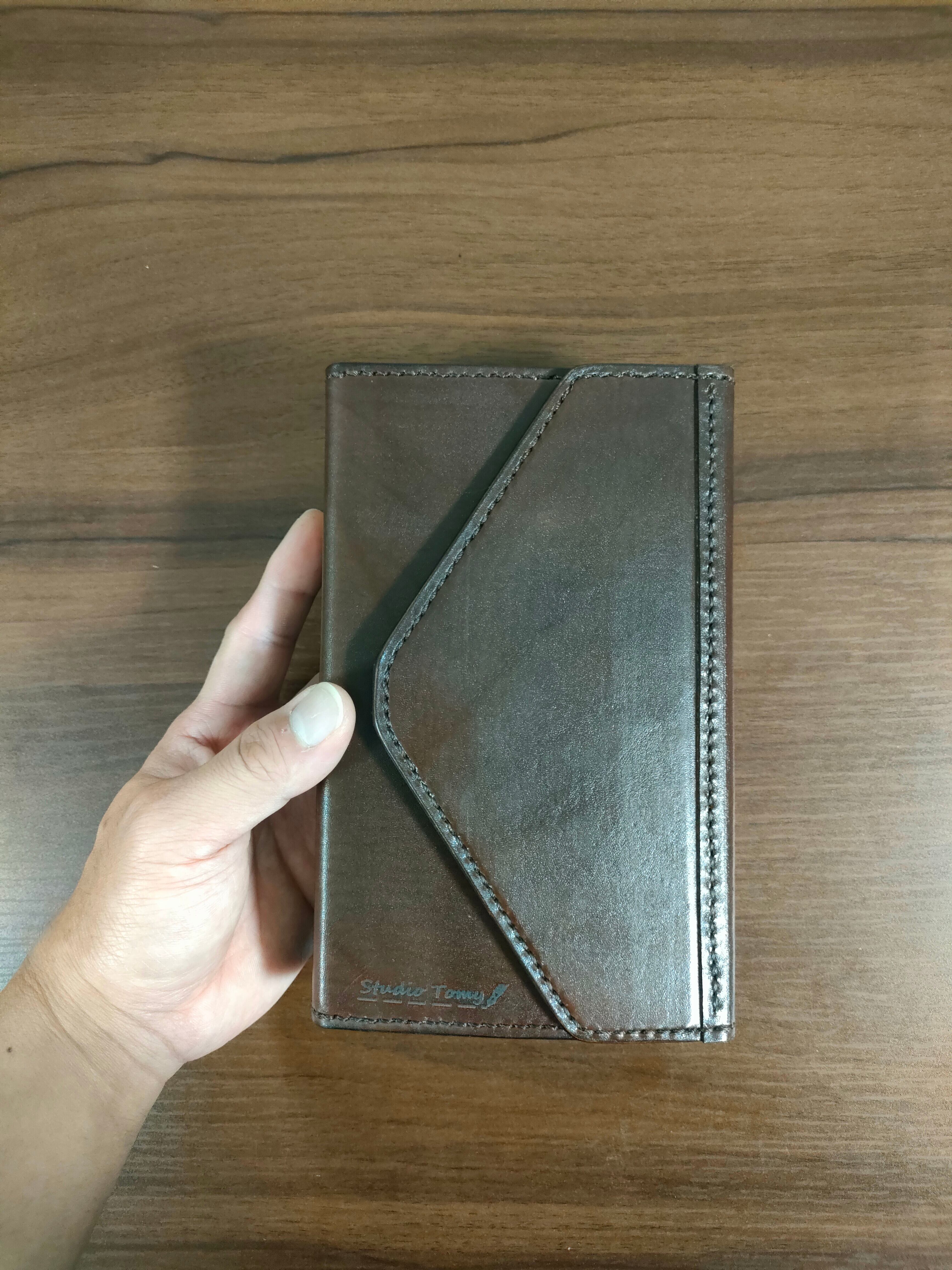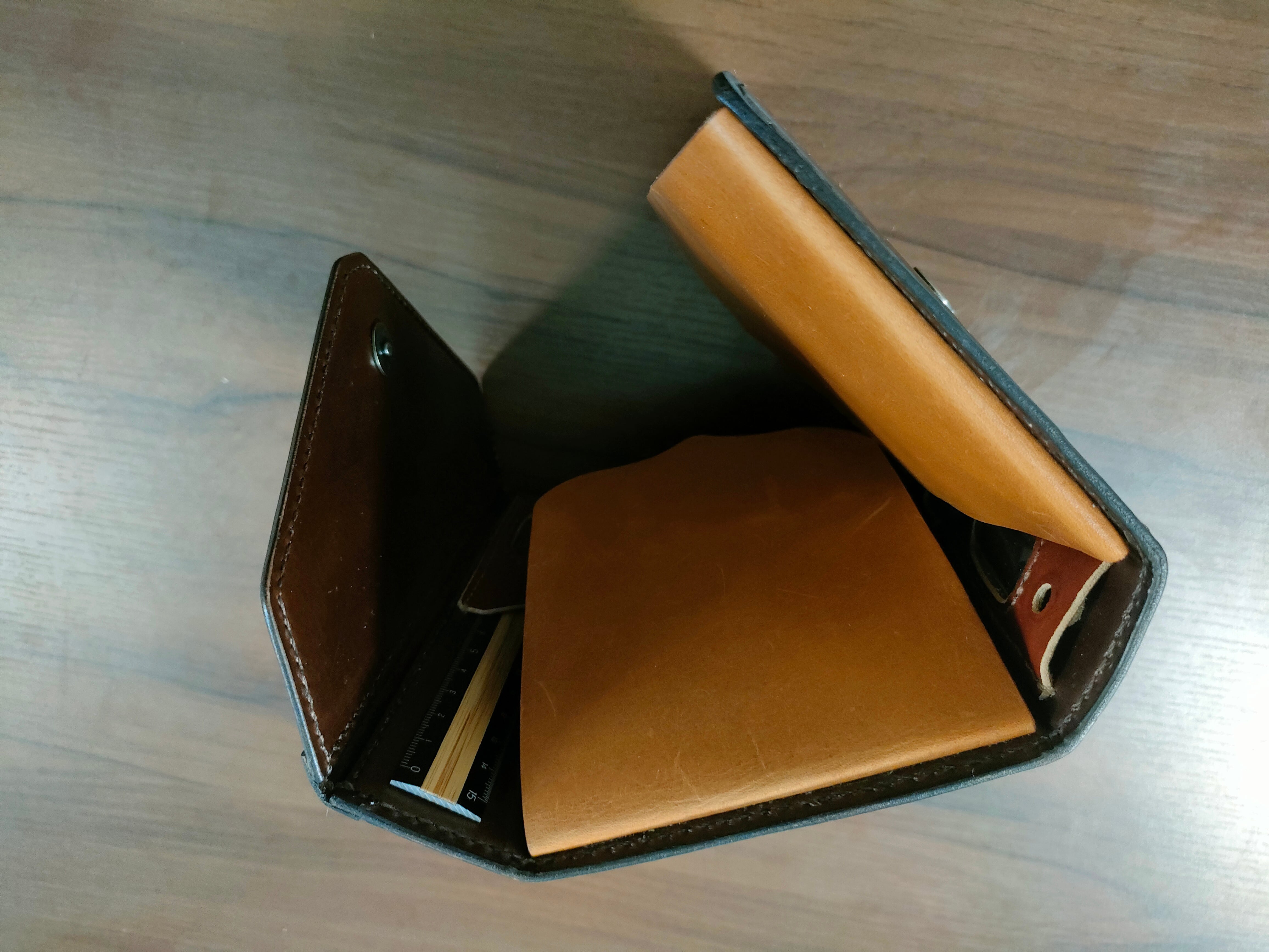 ロールペンケースのように素早く展開して全部のペンにアクセスできるように、かつサッと仕舞えるように考えました。革の間に樹脂の芯材を入れているのでパタパタと四角く折り畳むだけでペンケースを閉じることができる仕組みです。