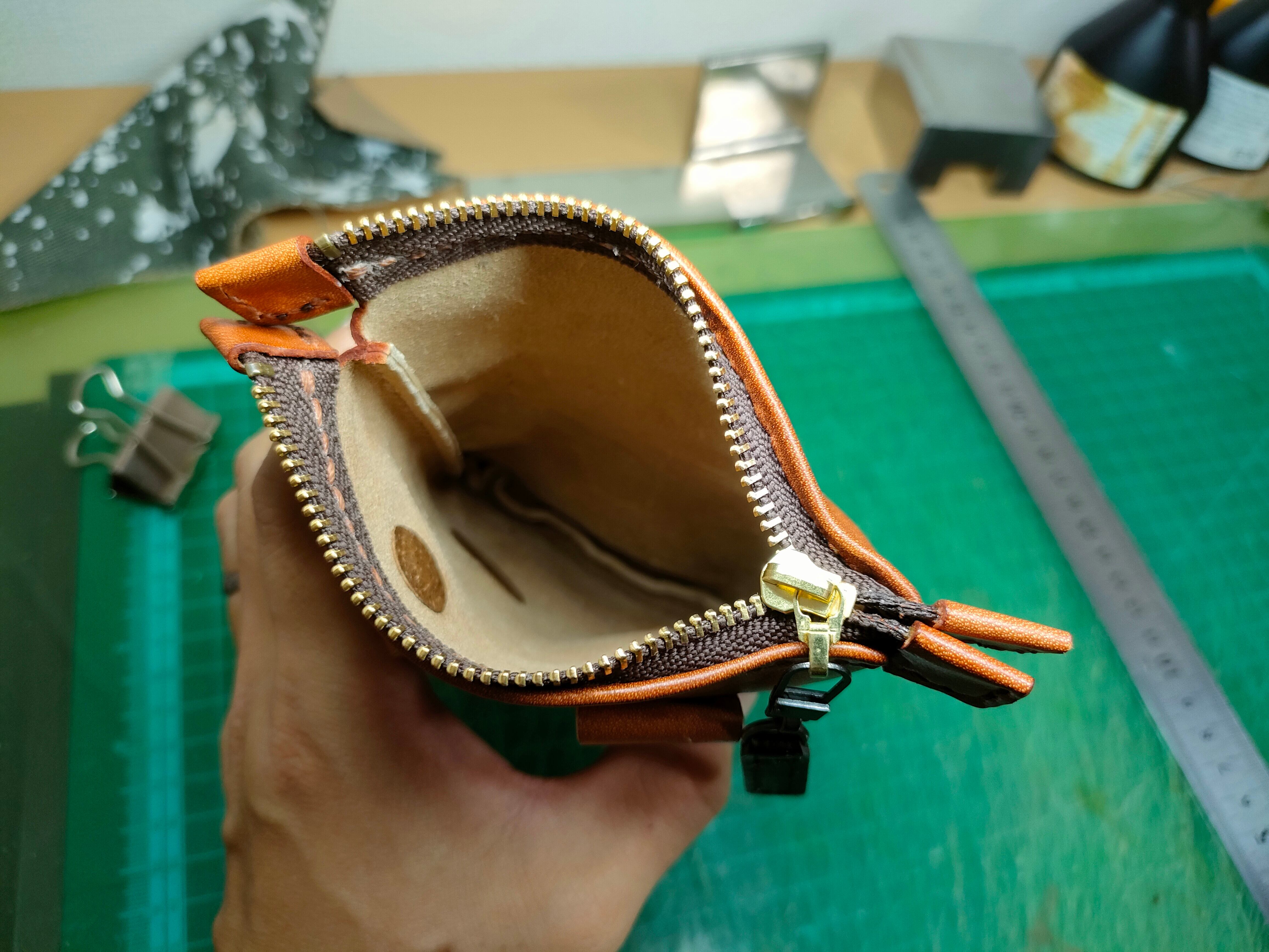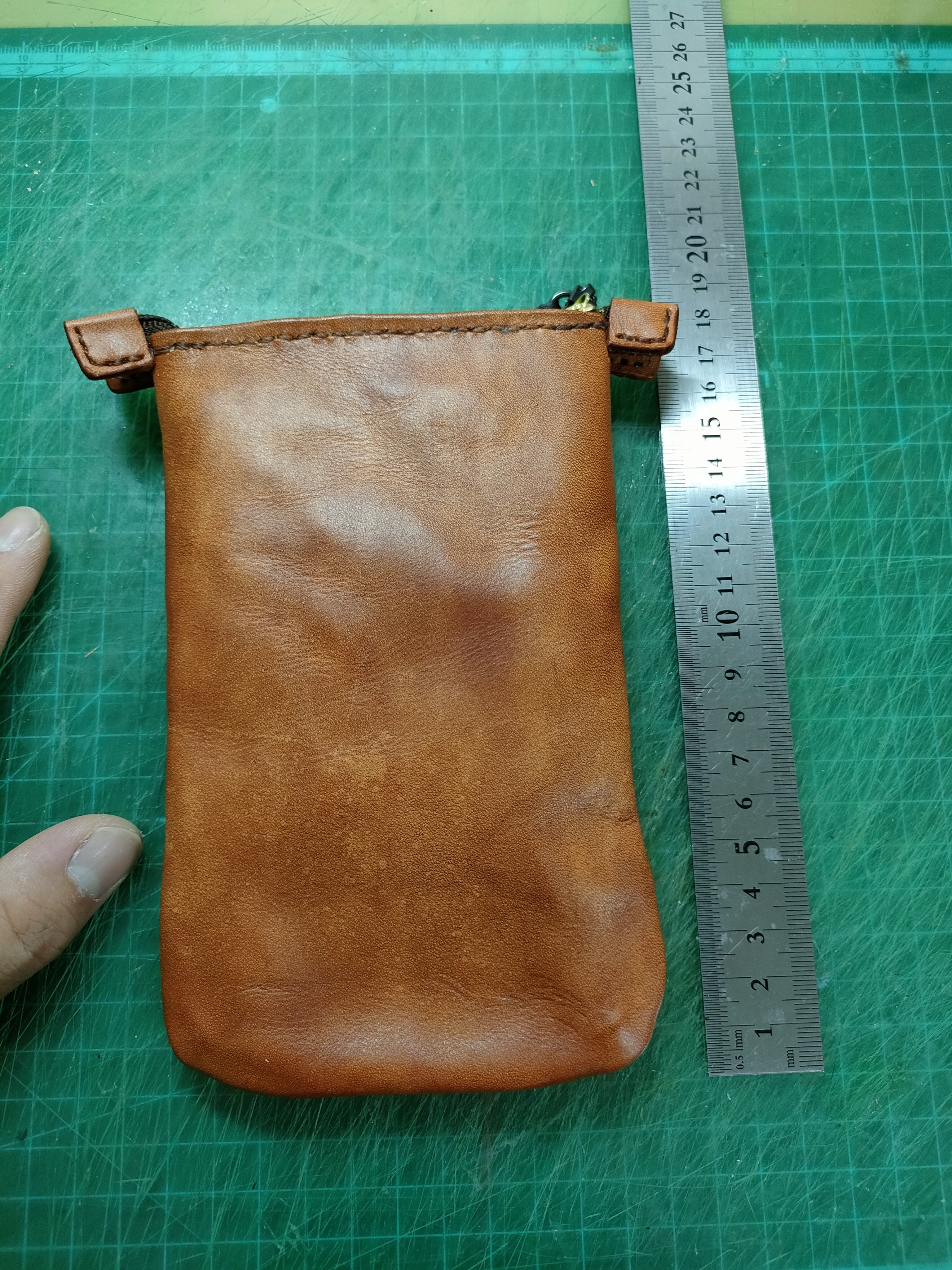 受注生産です。画像のものは試作品ですので、ファスナー部の余裕などを少し改良しますがベースは同じです。手持ちの染料で在庫があれば希望の革の色にすることができます。まずはご相談ください。一般的なスマホが入る大きさですが、財布を入れる、ハンカチとティッシュを入れるなど、入れるものに合わせてサイズを変更して作ることができます。