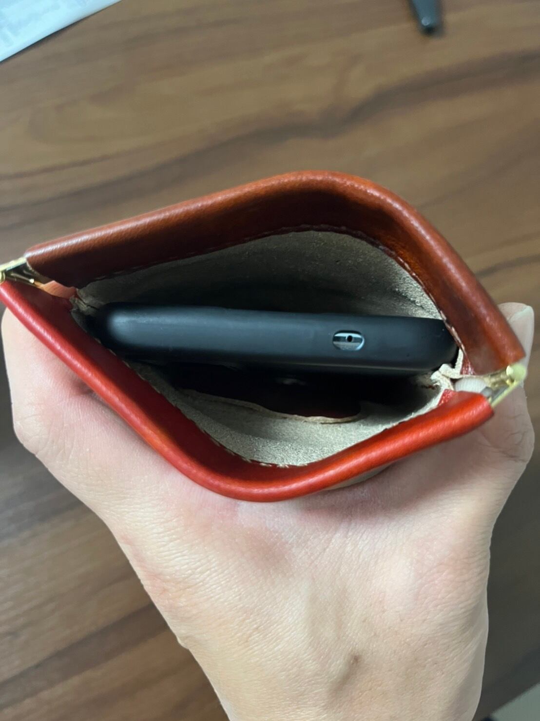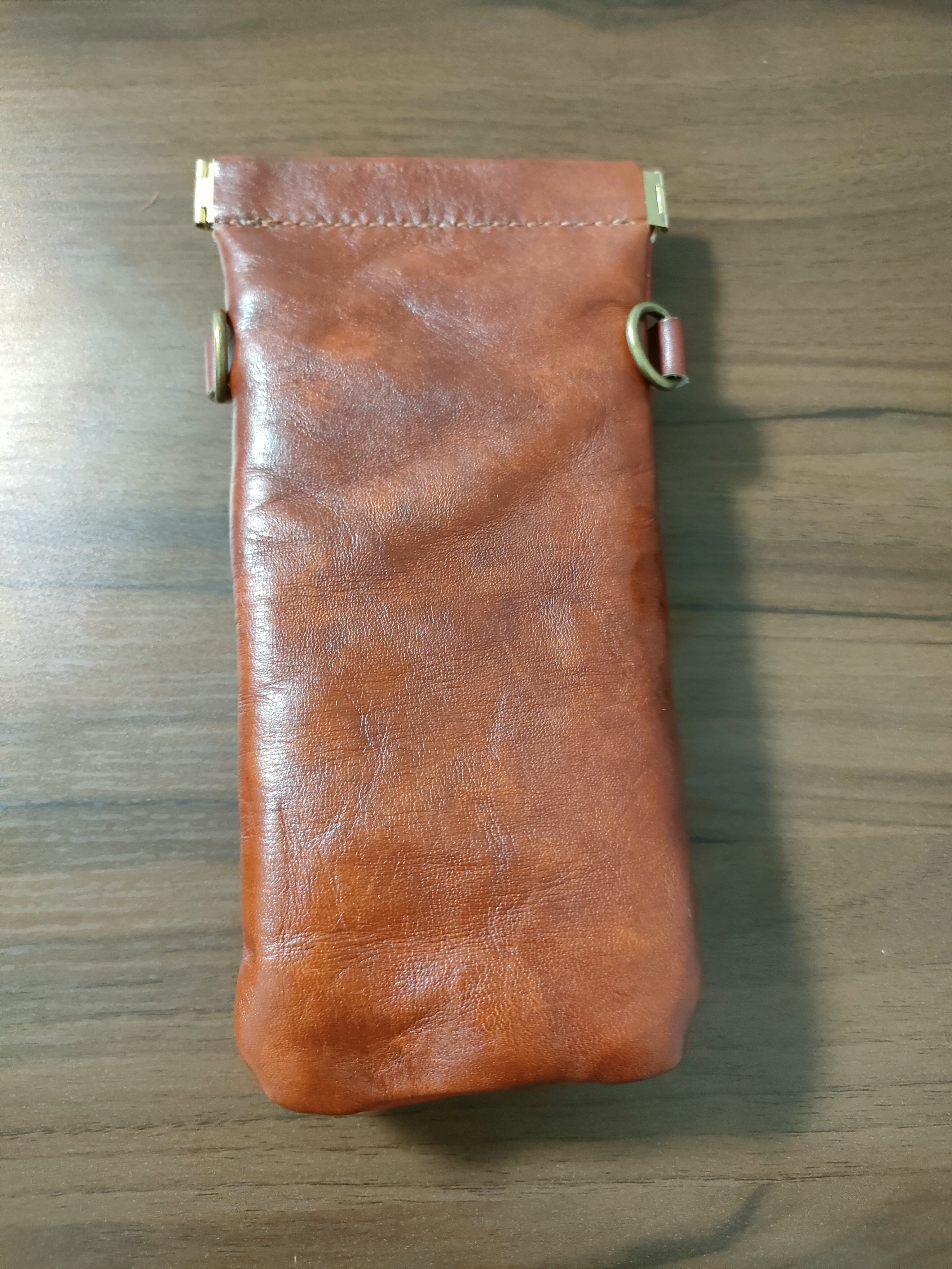 バネ口金を使っているのですぐに開閉できて、それなりに激しく動いてもスマホは落ちません。ヌメ革を染色して内縫いでひっくり返しています。長さ15cmを超える大きめのスマホを収納可能です。