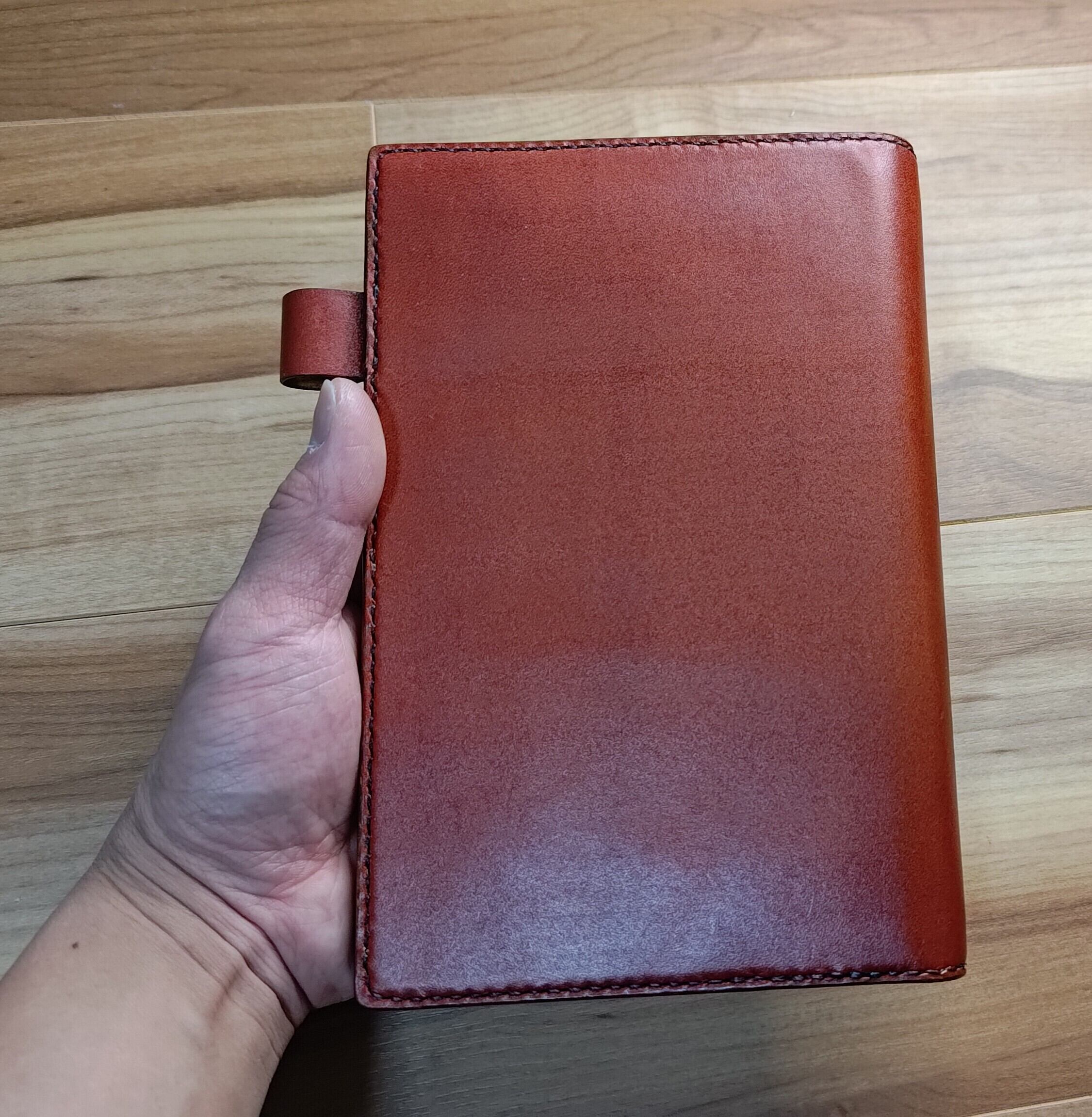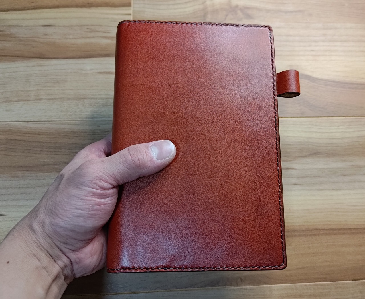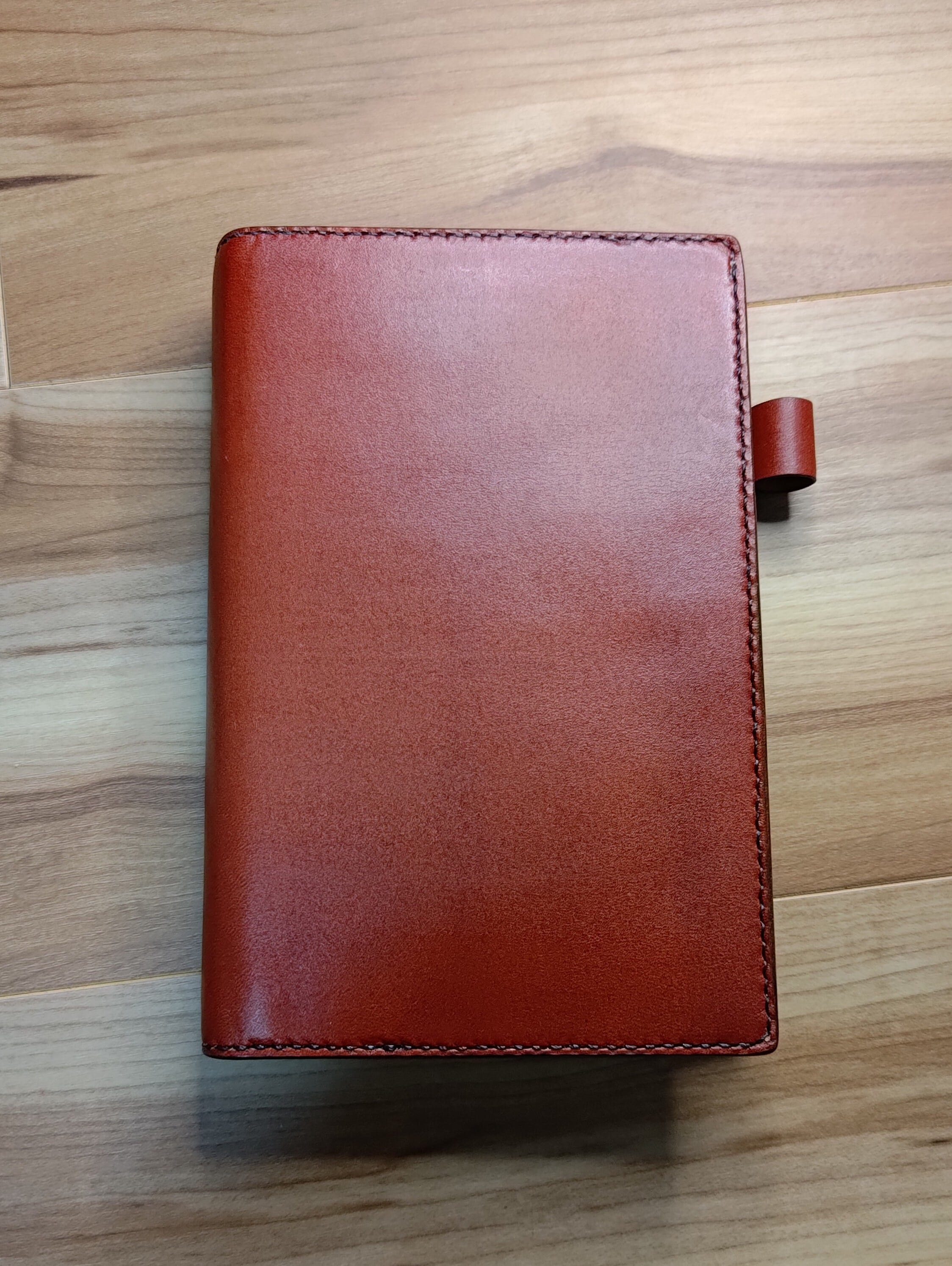 一般的なバイブルサイズのシステム手帳です。信頼と実績のクラウゼ社のバインダー金具を使ったヌメ革製です。ベルトや隅飾りのないシンプルな構造にしています。
