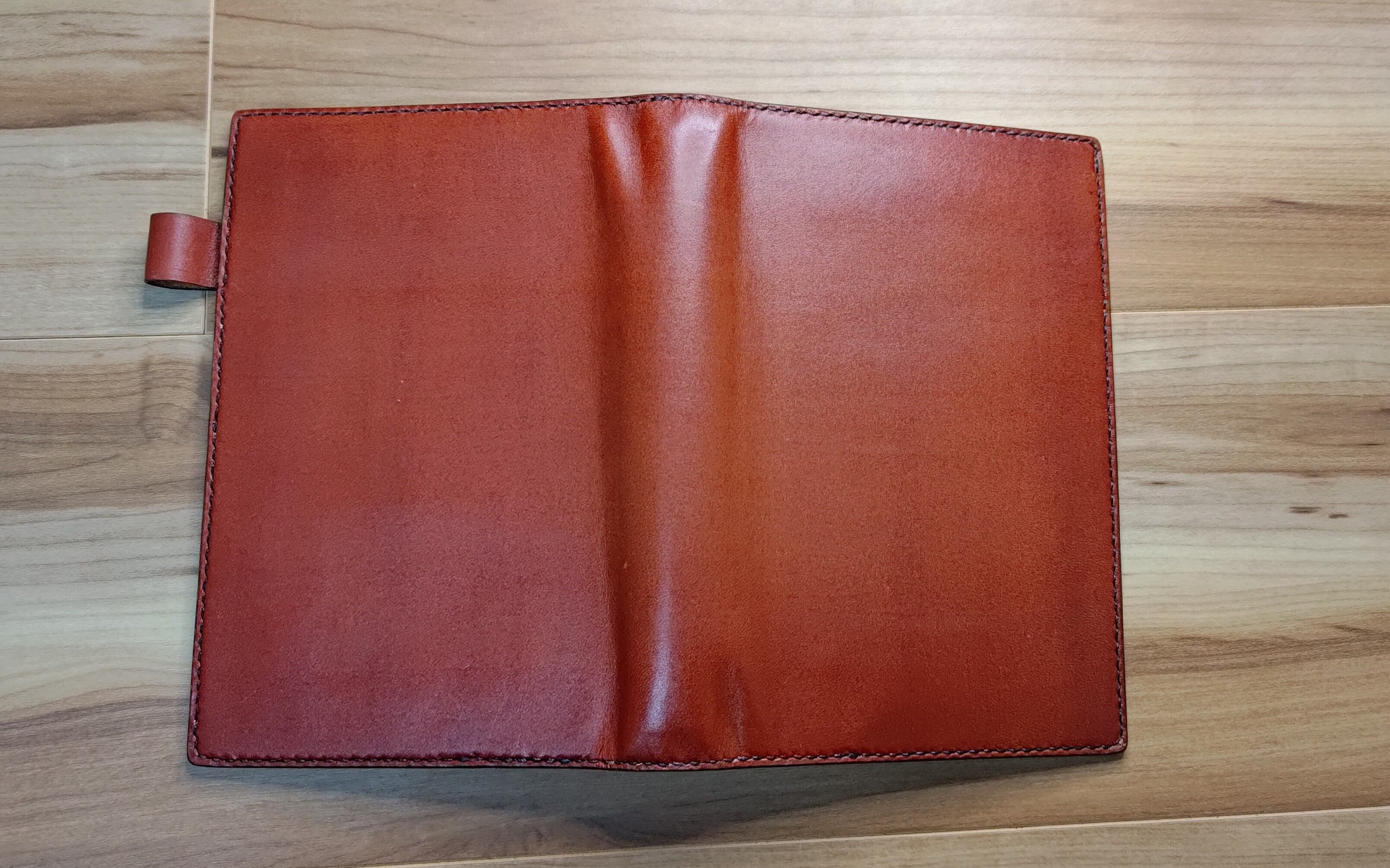 システム手帳を革で作るときに注意するのは内革と表革の内外寸差です。閉じたときにピッタリでも開くと革が突っ張ってフラットに開かない、といったことが起きがちです。スムースに開いて閉じられるように表革と内革に寸法差をつけて作ってます。革と革の間にはプラスチックの芯材を入れて、文字を書くときにフニャフニャにならないようにしています。カッチリと自立し、手に持ったときは革の柔らかさを感じられるように作りました。